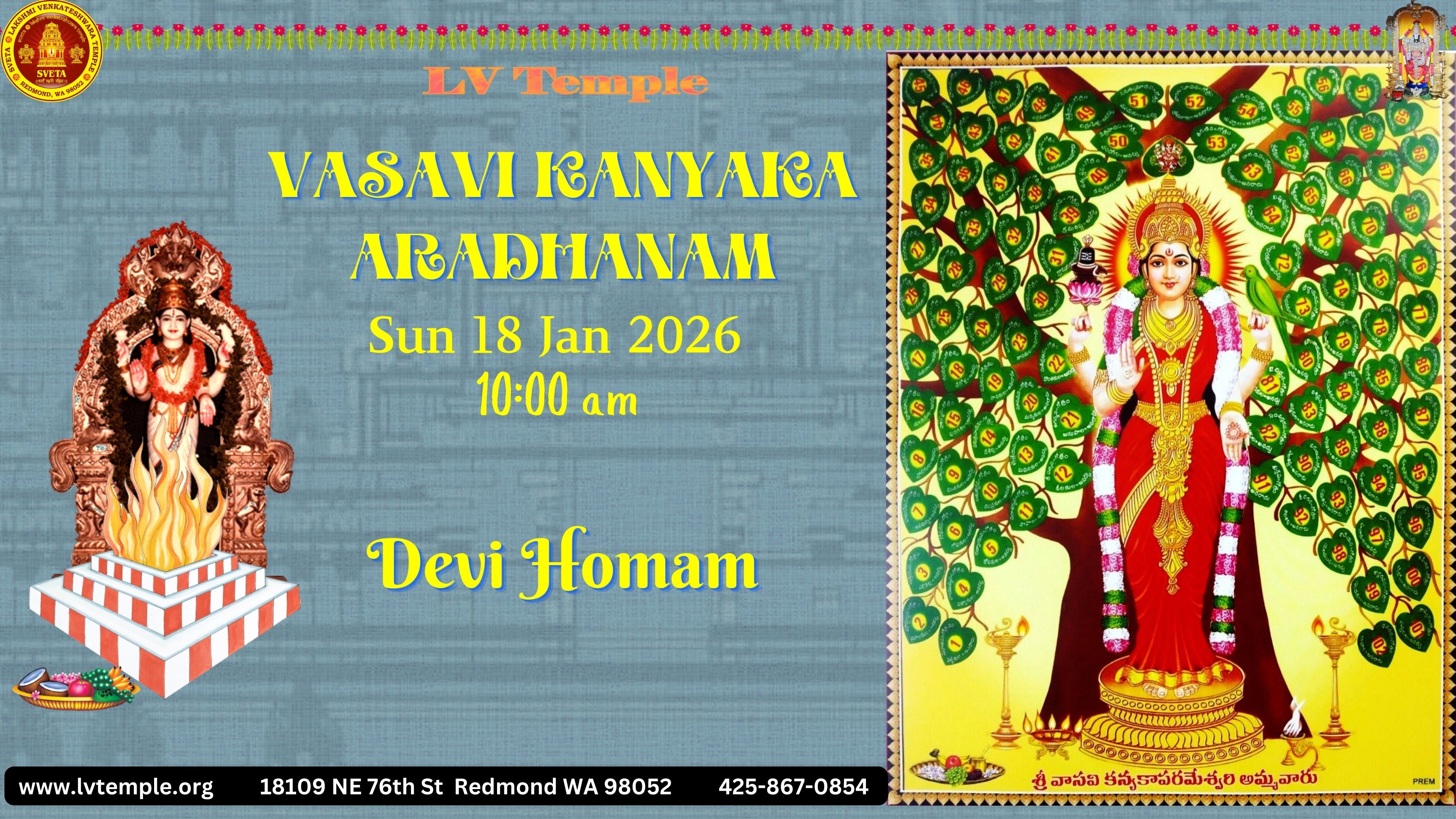 January 18 @ 10:00 am - 12:30 pm Shri Vasavi Kanyaka Aradhanam SVETA LV Temple Lakshmi Venkateswara Temple, 18109 NE 76th St, STE#105, Redmond, WA, United States