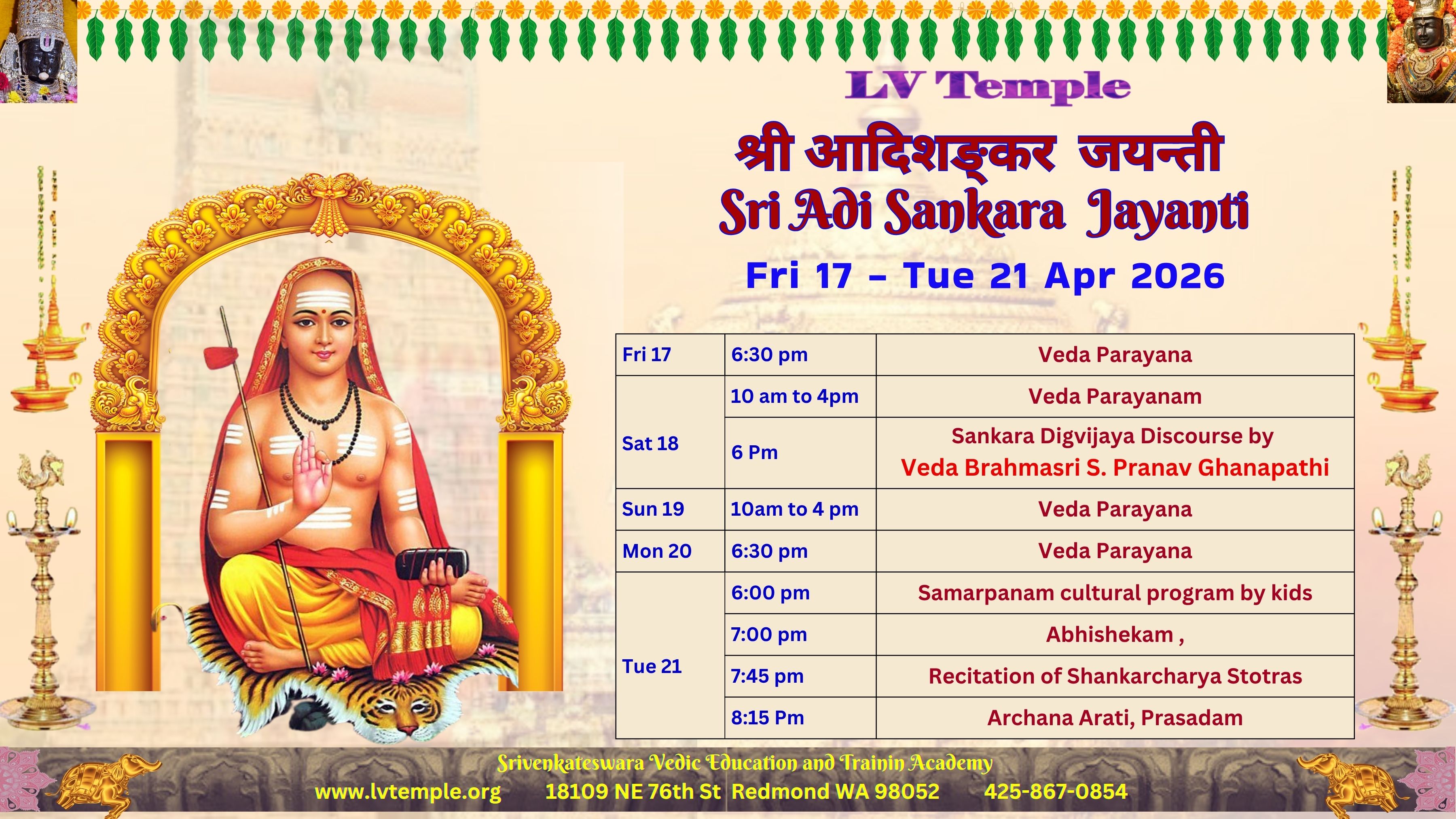 2026 – Lakshmi Venkateswara, Maha Lakshmi & Andal Abhishekam/Tirumanjanam May 2 2026 – Lakshmi Venkateswara, Maha Lakshmi & Andal Abhishekam/Tirumanjanam Featured 10:00 am - 2:00 pm