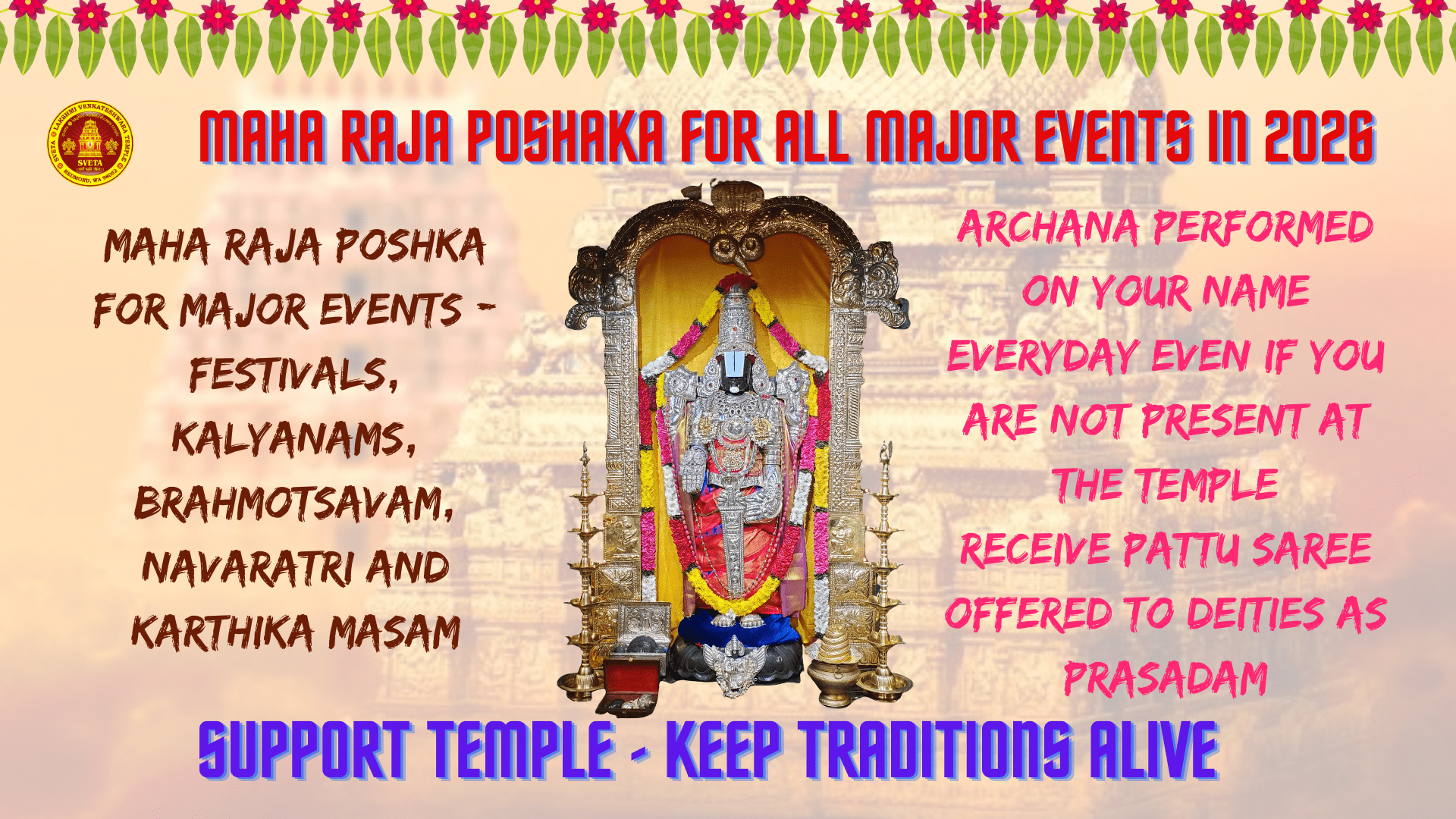 Maharaja poshaka for all events in 2026. Archana performed on your name every day even if you are not present at the temple. Receive Pattu Saree offered to deities as… Continue reading Maharaja Poshaka – All events 2026